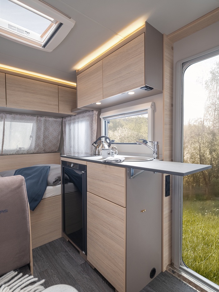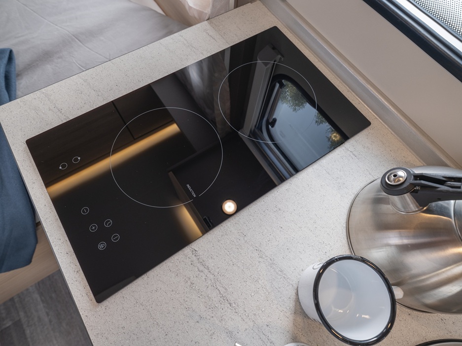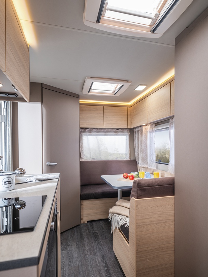 Moderne inrichting in zuidelijke stijl. Een 230V glaskeramische kookplaat. Een 60 liter compressor koelkast. En een combinatie van elektrische verwarming en airconditioning die een comfortabel leefklimaat creëert, zelfs in de zomer. Dit alles maakt de CaraCito een zeer aantrekkelijke vakantiebegeleider voor het hele kampeerseizoen!