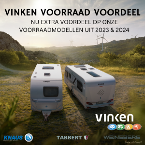 Bij Vinken profiteert u nu van extra voordeel op onze voorraadcaravans van Knaus, Tabbert & Weinsberg en voorraadcampers van Weinsberg. Zo bent u verzekerd van een nieuwe caravan of camper voor volgend kampeerseizoen. Sla dit jaar nog je slag!
